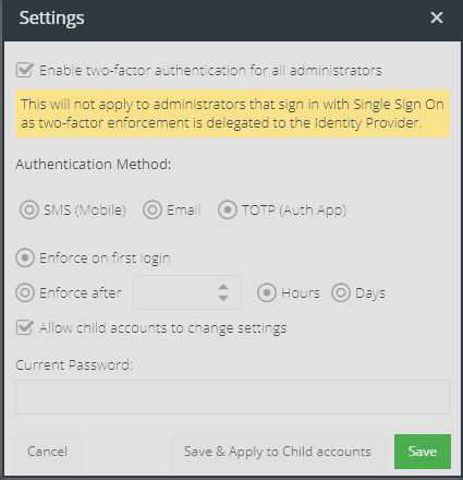 - Allow child accounts to change settings - if your account has provisioning rights, this option controls whether child accounts can override the enforcement settings.