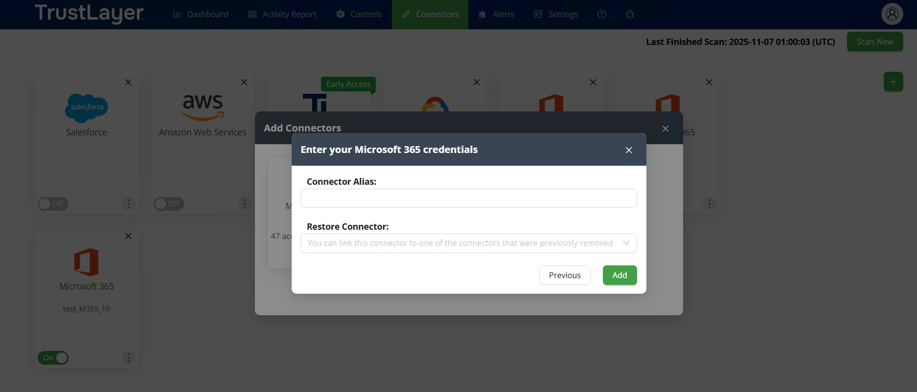 - You can also restore one of the connectors you’ve removed within the last 90 days. Thus, all its historical scans will be linked to the new connector you are adding.
