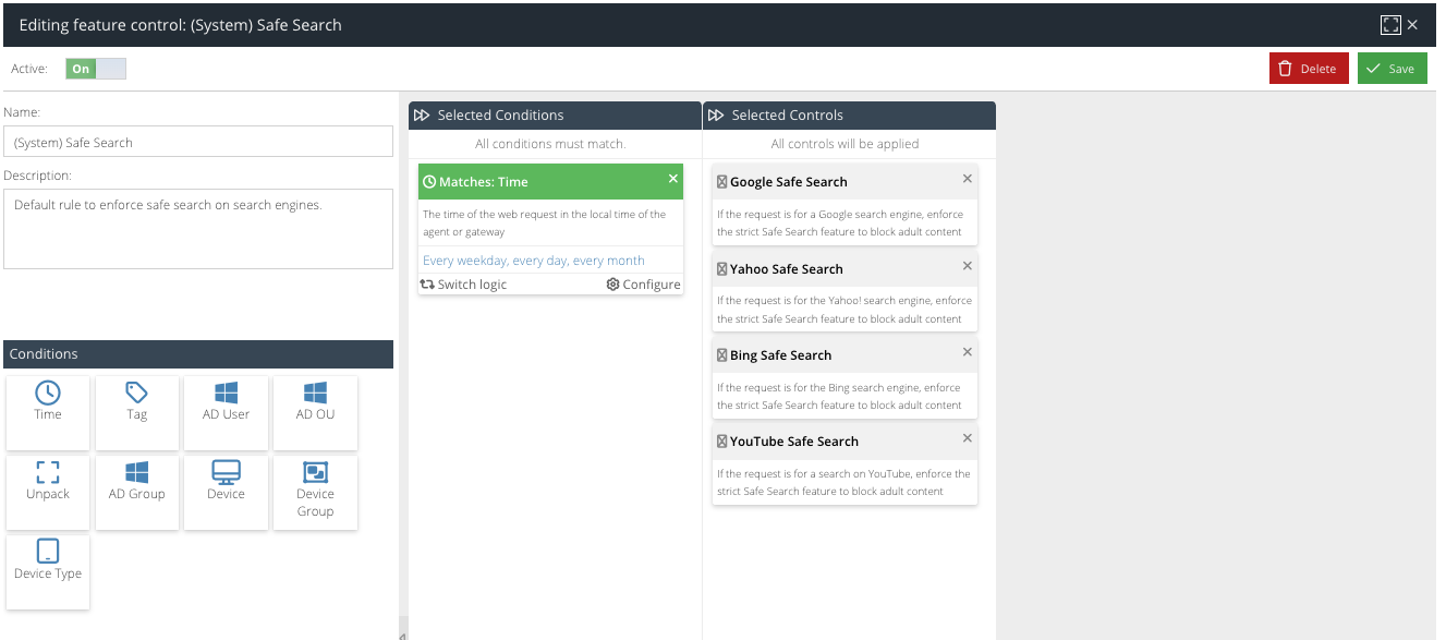 Our Feature Control settings are enabled by default and enforce control over third-party web services such as search engines, YouTube and Google Apps.